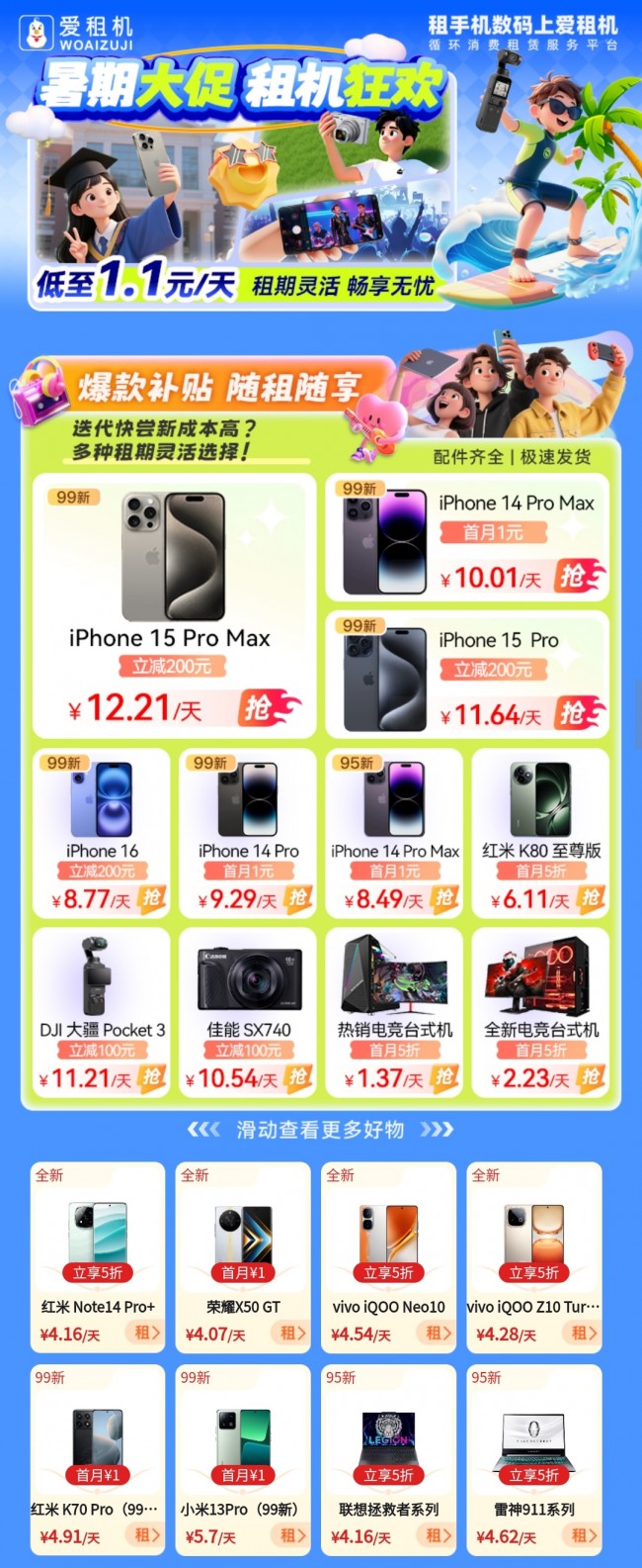 期大促本次暑,门手机数码产物的租赁办事爱租机为大师打算了浩瀚热,1元首月码设备热租来袭11元天,200立减,令人心动的优惠行为大个人产物都有极度。