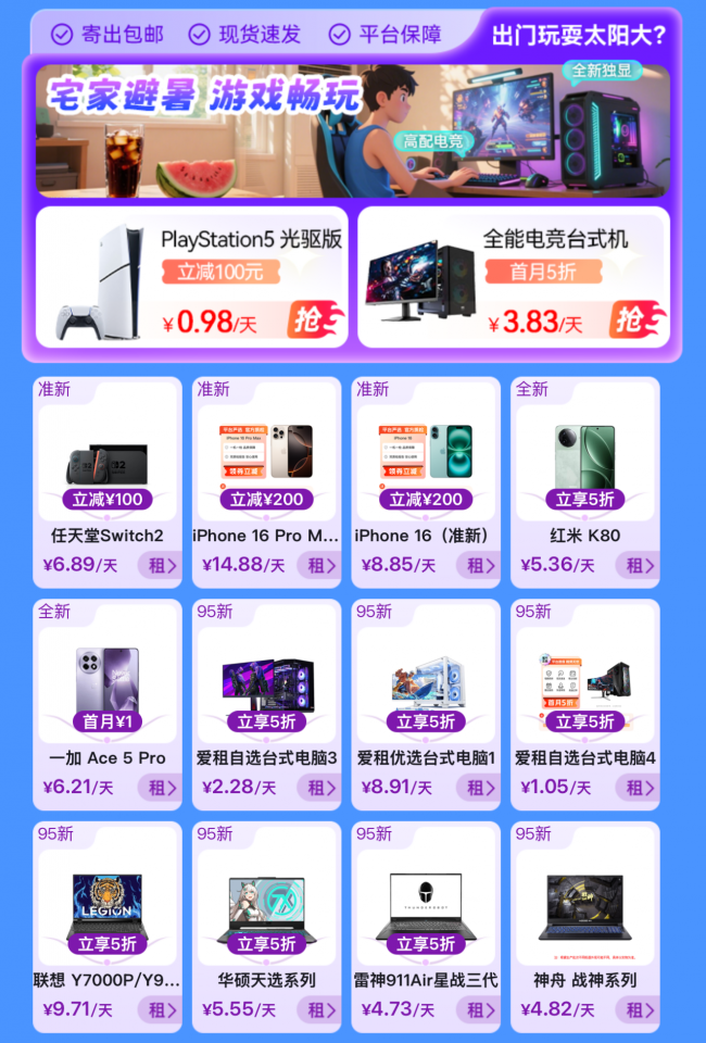 炎炎夏季,是不少人的采选宅家电竞游戏。打算了充分的游戏神器爱租机为游戏酷爱者们,月5折且首,1元低至。