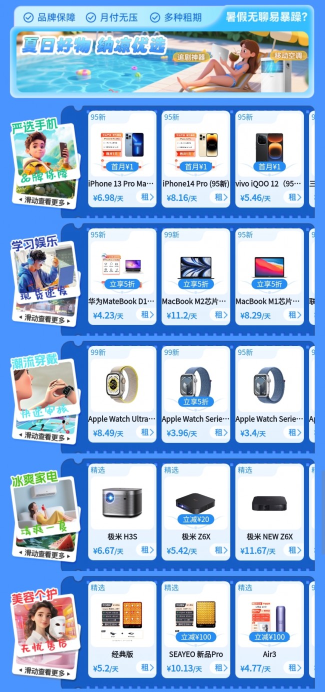 热点产物除了上述,、潮水穿着、冰爽家电、美容个护等多品类、多场景租赁办事爱租机暑期大促还为用户周到打算了厉选手机、练习文娱修立。这里正在,练习的平板电脑你可能租到适合,求的智能音箱知足文娱需,智能腕表时尚的,空调扇清冷的,美容仪等以及各种,供无忧售后爱租机提,爽一夏让你清。